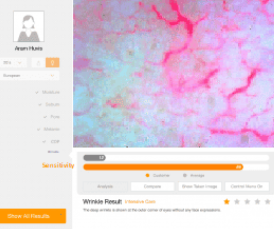 • Zmarszczki – analiza linii i bruzd wynikających z mimiki, utraty kolagenu oraz poziomu nawilżenia skóry.